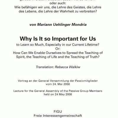 … gerade in diesem aktuellen Leben viel zu lernen? oder auch: Wie befähigen wir uns, die Lehre des Geistes, die Lehre des Lebens, die Lehre der Wahrheit zu verbreiten?